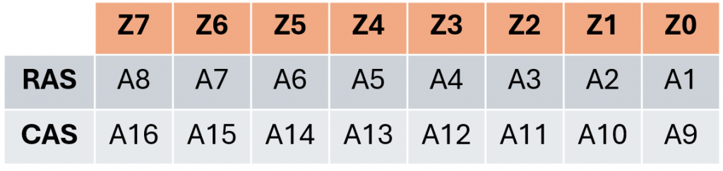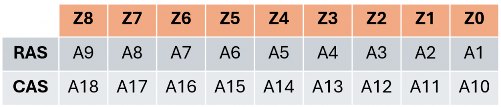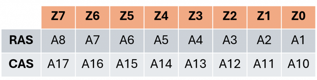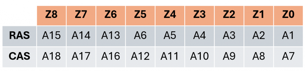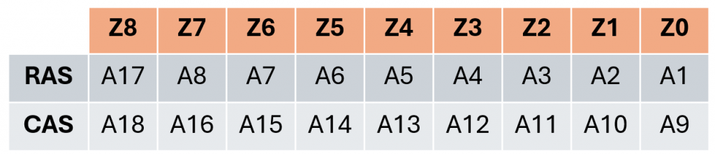 In 2016, I documented my findings and did not pursue the reasons further, but during my recent research, I decided to validate my earlier findings (they were correct) and consider why the address lines were jumbled like this. I noticed both address lines were sent on multiplexed address line Z8, the highest order line. I initially theorized that either: